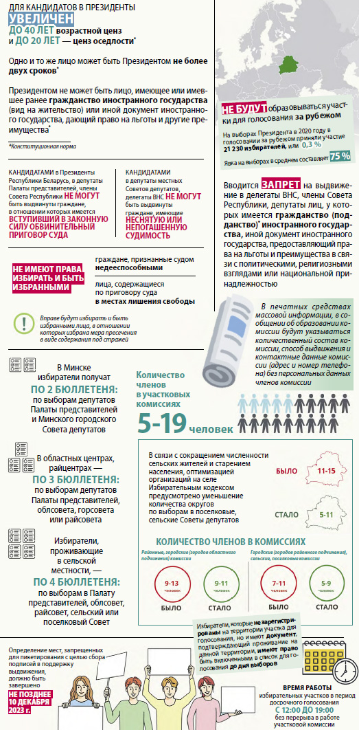 — Нынешние новации в избирательное законодательство страны обусловлены принятием изменений и дополнений Конституции Республики Беларусь, а также появлением новых законодательных актов. Например, значительная часть изменений Избирательного кодекса связана с появлением высшего органа народовластия — Всебелорусского народного собрания, а также с необходимостью со стороны государства в целом и ЦИК в частности решать новые стратегические задачи. Назову основные: