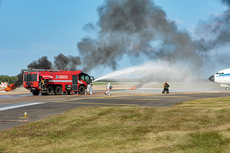 Учения по поисковому и аварийно-спасательному обеспечению полетов прошли в Национальном аэропорту Минск 4 сентября, сообщает корреспондент агентства «Минск-Новости» со ссылкой на Telegram-канал Minsk Airport.