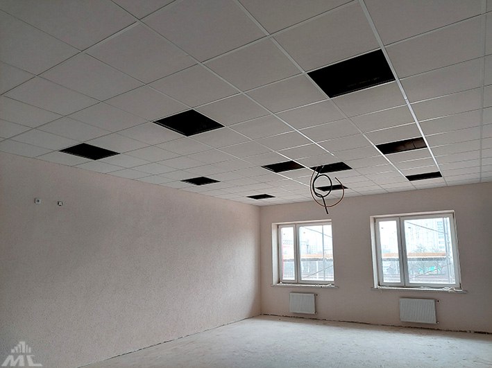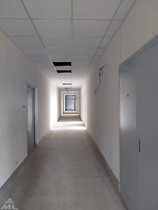 Отделка на первом и втором этажах почти закончена: завершаются малярные, плиточные, чистовые электрические и сантехнические работы, укладка плитки и монтаж подвесных потолков. Затем начнется отделка третьего этажа.