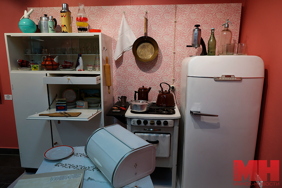 В послевоенное время вместе с электрификацией и газификацией города стали появляться новые бытовая техника, виды мебели и посуды. Этот важный переход также можно проследить по экспонатам выставки. Здесь есть как знаменитый примус, так и инсталляция советской кухни 1960-х с газовой плитой и запирающимся холодильником «ЗиЛ». Шутка про замок на холодильнике была вовсе не шуткой для жителей коммунальной квартиры…