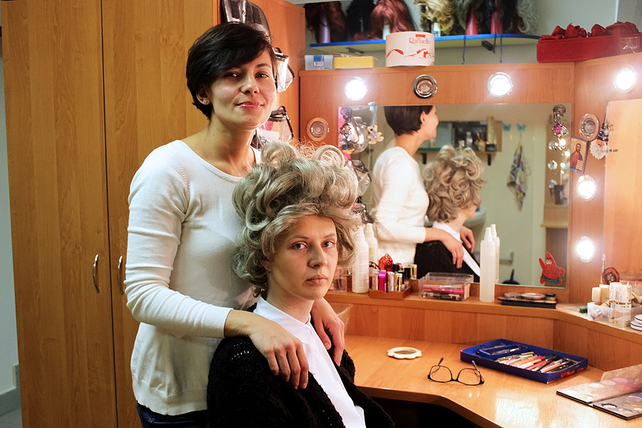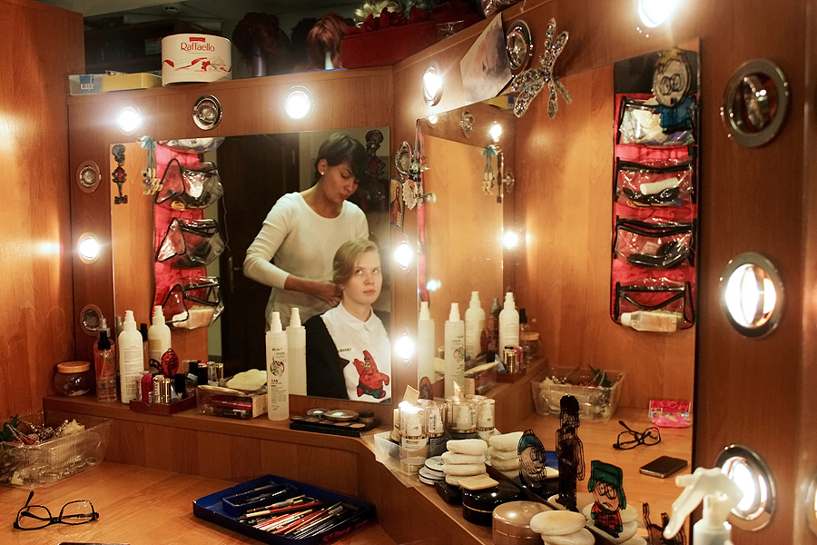 Место действия — Драматический театр белорусской армии. В небольшой уютной комнате, куда ни глянь, везде увидишь свое отражение. С полок свисают королевские и не очень парики, с расклеенных по стенам афиш и фотографий за каждым шагом пристально наблюдают актеры. На рабочем столе, подсвеченном яркими лампами, аккуратно расставлены разные баночки, коробочки, кисточки — без них чудеса преображения невозможны.