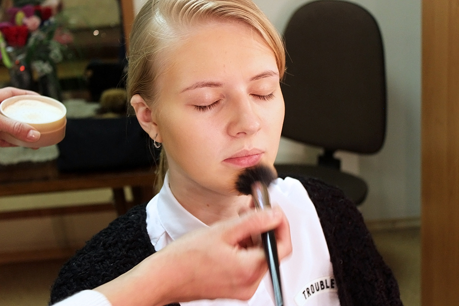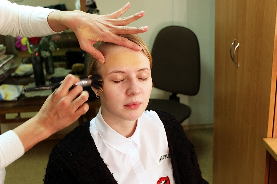Сажусь в кресло, немного заинтригована: мне предстоит стать немного старше… Лет так на 30. Как говорит Алена, добавлять возраст артистам приходится частенько. И первый шаг — сделать кожу темнее. Как-никак со временем ее оттенок меняется, да еще и пигментные пятна появляются. На помощь приходит обыкновенный тональный крем. Главное, чтобы цвет отличался от вашего естественного. В моем случае все просто — кожа настолько бледная (недаром в школе дразнили мертвецом), что почти любое средство подойдет. Пара мазков и взмахов кистью — холст готов. Теперь старческие изменения станут заметнее. Надо только припудриться, чтобы грим лучше ложился.