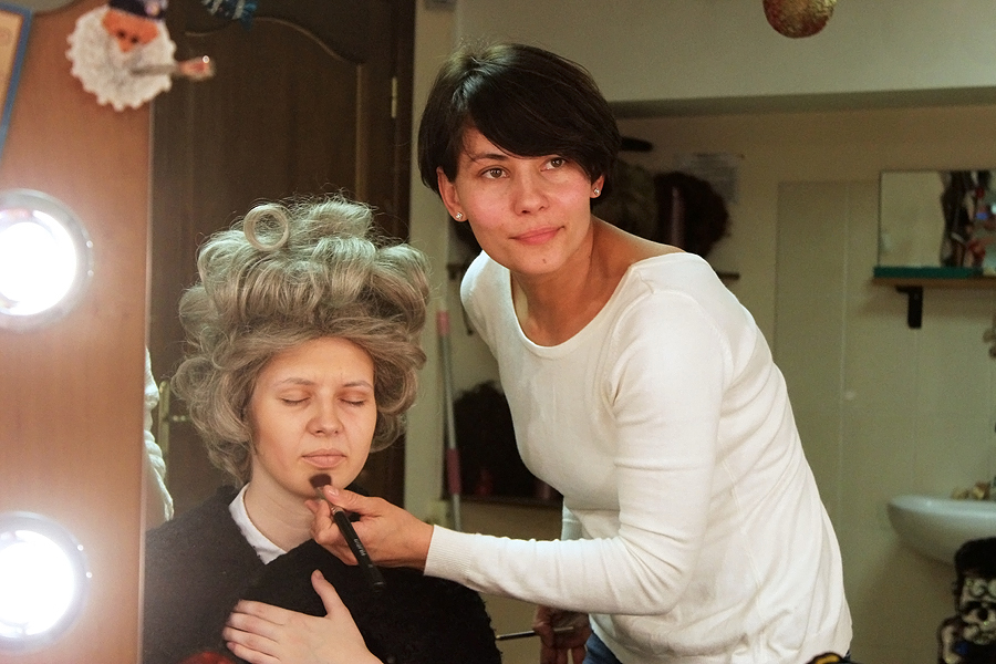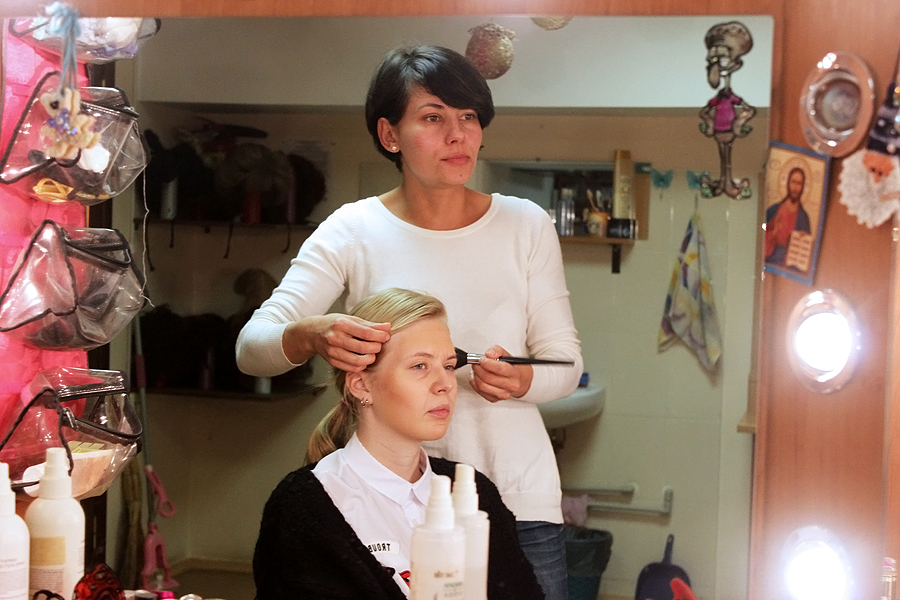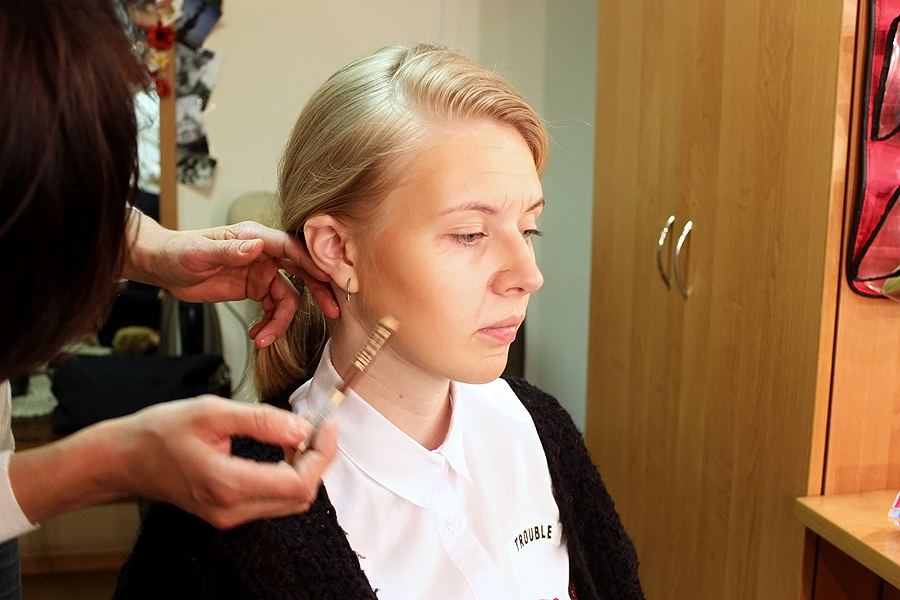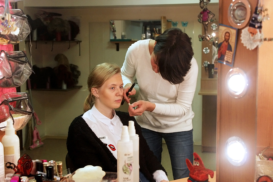 Алена Саенко работает гримером уже 6 лет. Еще в школьные годы перед каждой вечеринкой «создавала лица» всем своим подругам, испробовав на них всевозможные палитры и сочетания цветов. Правда, получив аттестат, выбрала куда более традиционную профессию экономиста. И, только когда стала мамой, поняла: пора завязывать с бумажной волокитой и заняться чем-то творческим. Окончила курсы визажиста (на гримеров в Беларуси пока не учат. — Прим. авт.), долгое время работала в кино, а недавно перебралась в театр. Как оказалось, сценический грим сильно отличается от киношного: за счет множества акцентов и четких линий он куда более выразительный. Ведь зритель должен видеть актера, его эмоции из любой точки зала.