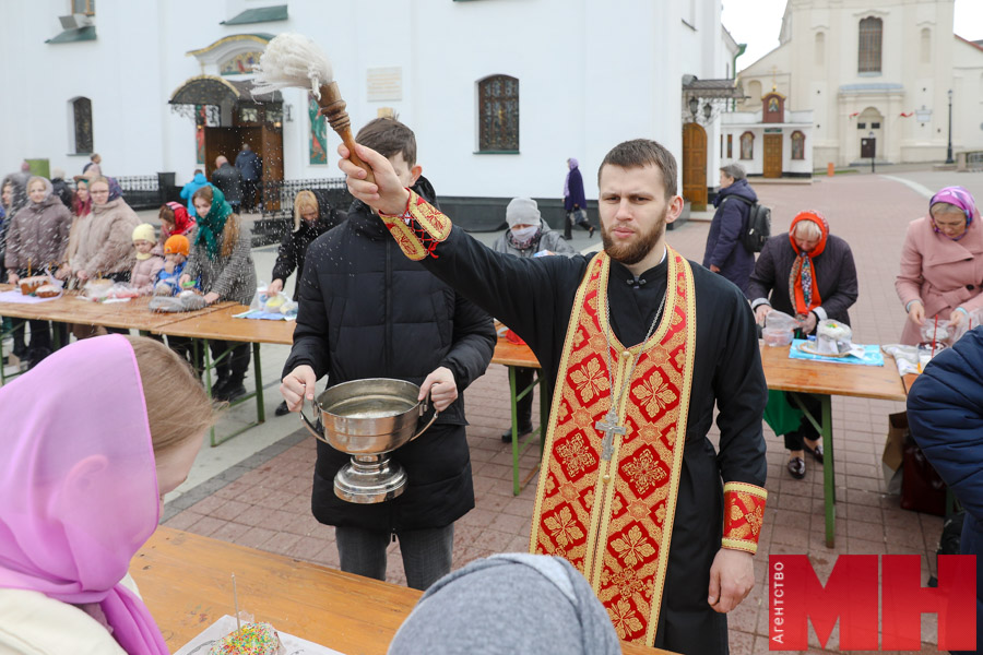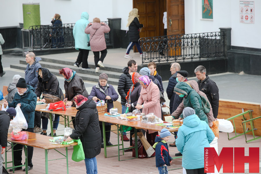 На праздник Христова Воскресения множество минчан пришли к Кафедральному собору Сошествия Святого Духа осветить пасхальные куличи и снедь, передает корреспондент агентства «Минск-Новости».