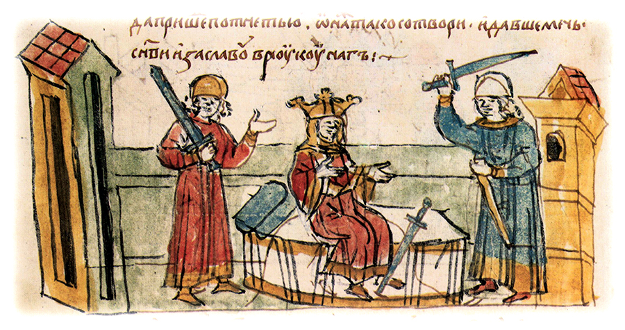 «Юный Изяслав вступается за свою мать Рогнеду». Миниатюра из летописи Радзивиллов
