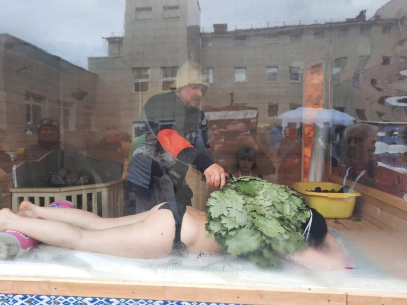 Тем временем в двух соседних мини-парных проходили индивидуальные процедуры по традиционному контактному парению по правилам народного чемпионата «Жогово». Его «фишка» в том, что у «моделей» глаза закрыты повязками, они не имеют права общаться с парильщиками. Полная анонимность. Такой подход позволяет погрузиться в свои тактильные и термические ощущения и беспристрастно оценить мастерство участников.