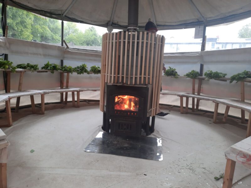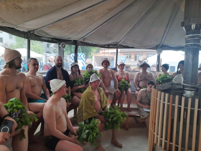 Воскресное утро выдалось прохладным, однако прибывающие на площадку возле здания банно-оздоровительного комплекса «Лазня» на ул. Марьевской участники и зрители уже находились в предвкушении высоких температур банного шоу. В отличие от предыдущего городского чемпионата, который состоялся осенью 2024-го, программа была расширена. Основной локацией по-прежнему стало сооружение круглой формы из легких металлоконструкций с полками по периметру и печью на дровах в центре. Оно предназначено для состязаний по коллективному парению. Еще две импровизированные бани поменьше — для индивидуального. Такие соревнования предусматривали отдельную программу и проводились у нас впервые.