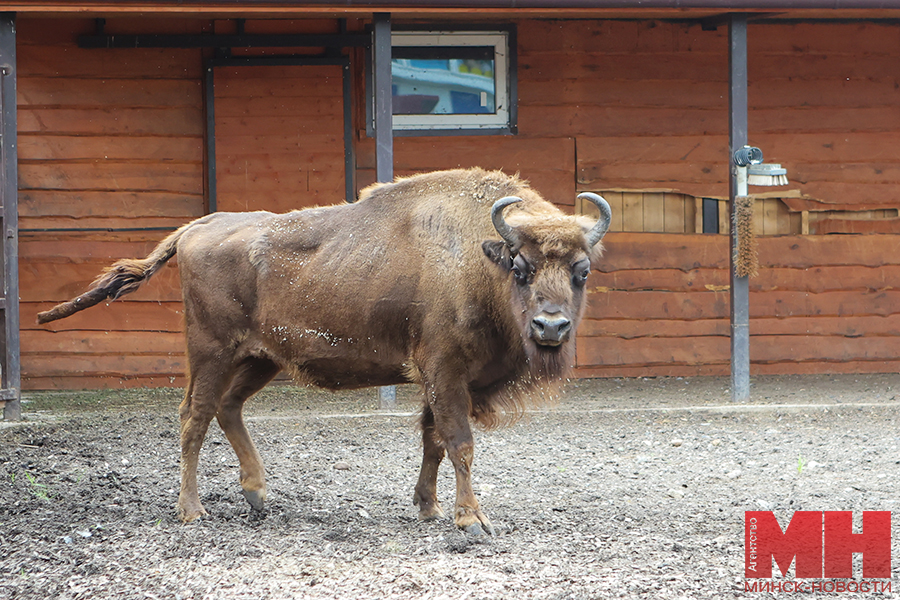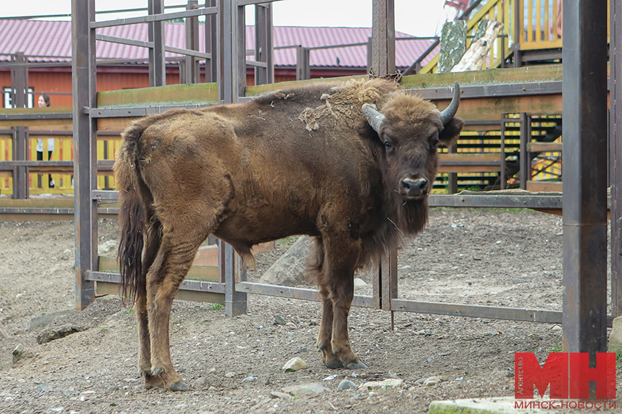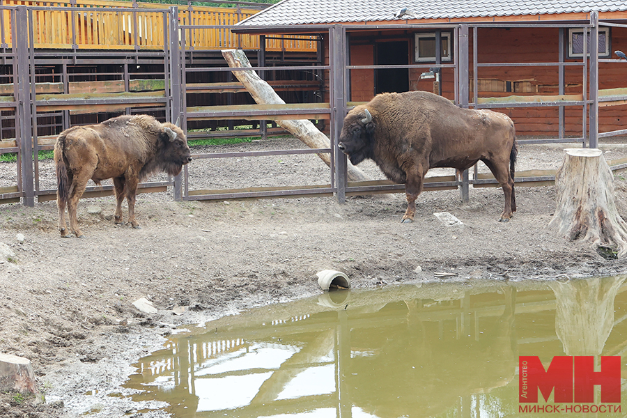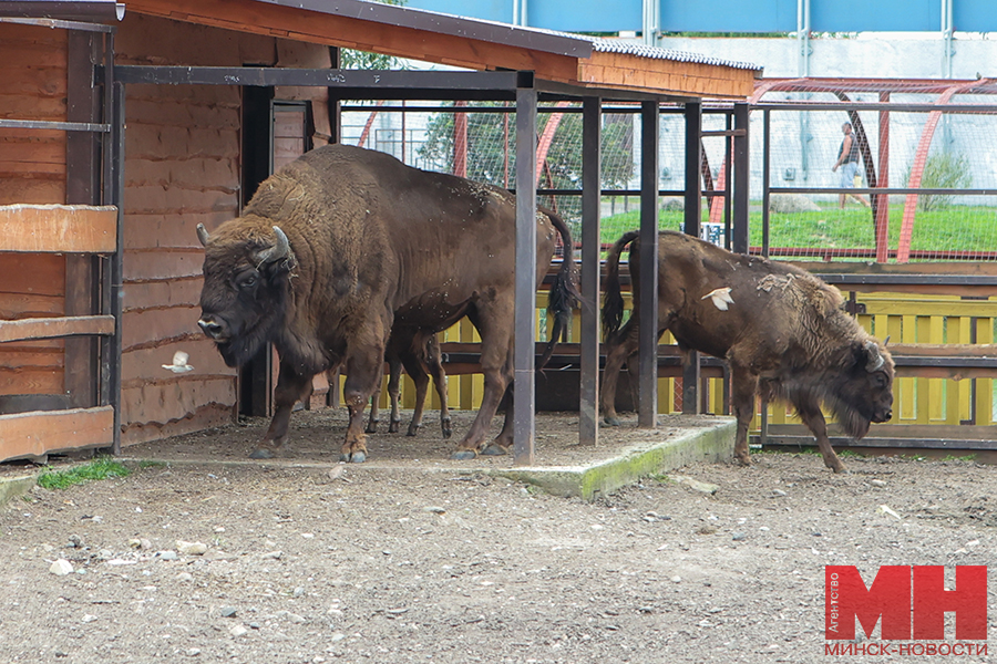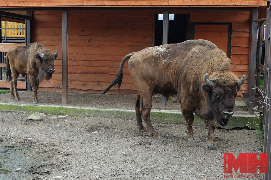 В зоопарке их уже четыре. В прошлом месяце у пары родилась малышка весом около 30 кг. Всех гигантов заносят в племенную книгу, имена у них на определенную букву. Пока теленок питается молоком матери. Когда подрастет, будет есть, как и взрослые особи, сено, зерно, овощи. Самка попала в Минск из Липецка, самец — из Могилёва. Ранее были представителями Беловежской Пущи. У вольера символа нашей страны всегда много посетителей, к тому же зубров разрешено кормить. Но только тем, что можно приобрести вместе с билетами в кассе зоопарка: морковью, кабачками, комбикормом и специальным печеньем. Подкормка практикуется и для всех копытных и птиц на водоеме.