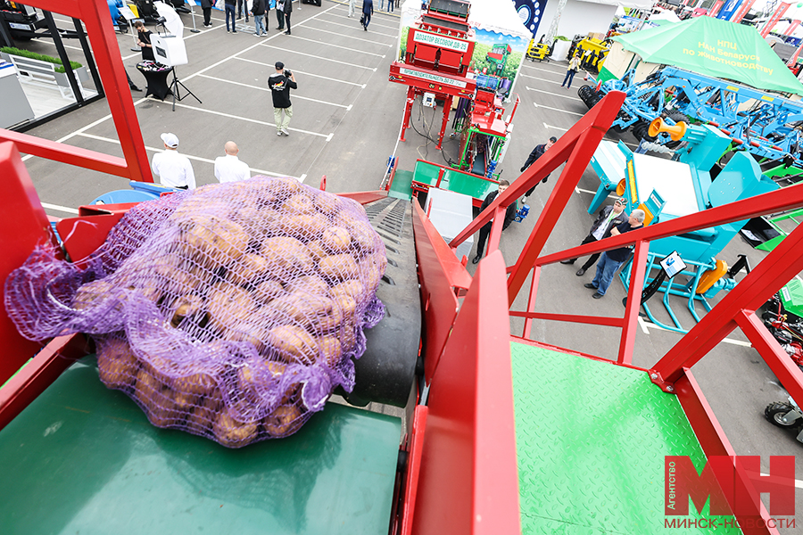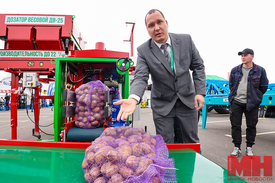 — Она производит взвешивание картофеля, лука, моркови и свеклы с производительностью 22–25 тонн в час, и упаковку в сетки овощей весом от 2-х до 25-ти кг без участия человека. Сетки подаются роботу, который механической рукой укладывает их на поддоны. Для полного цикла нужно участие всего двух работников: один загружает продукцию, другой принимает ее и перевозит. Думаю, вы видели в гипермаркетах овощи в сетках — их фасуют на наших линиях многие белорусские фермеры, — с гордостью рассказывает директор предприятия Александр Близнюк.