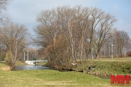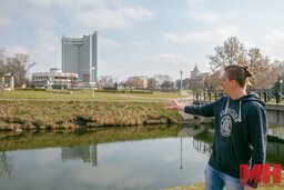 — Обратите внимание на то, как берега возвышаются над рекой, — говорит археолог. — Древние люди выбрали для стоянки сухое место неподалеку от воды. Пусть Свислочь не вводит в заблуждение. Она течет от плотины Комсомольского озера по рукотворному руслу уже 55 лет. Если взглянуть на довоенные карты, то прекрасно видно, что река протекала вдоль нынешнего проспекта Машерова. На перекрестке с проспектом Победителей поворачивала, дальше ее русло шло вдоль проспекта до выхода из подземного перехода и возвращалось в привычное нам место в нескольких метрах от этого мостика.