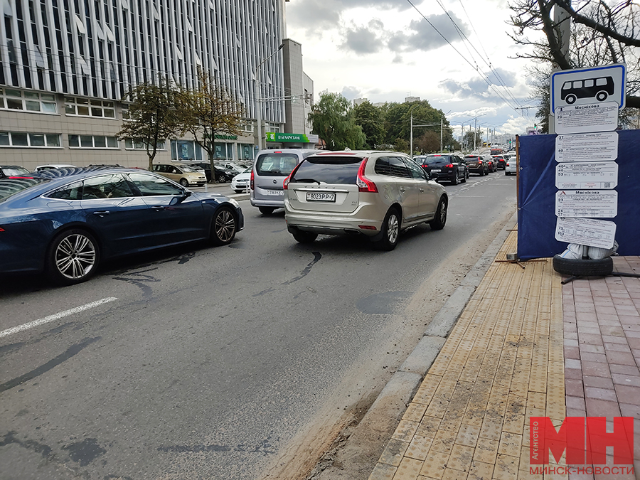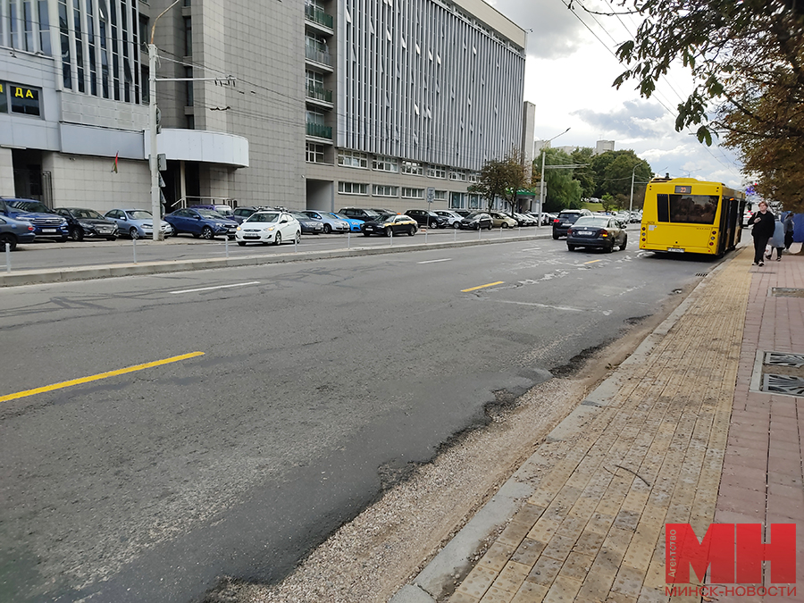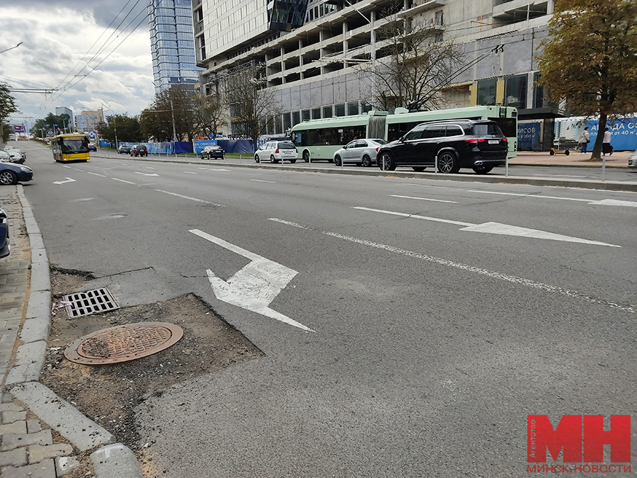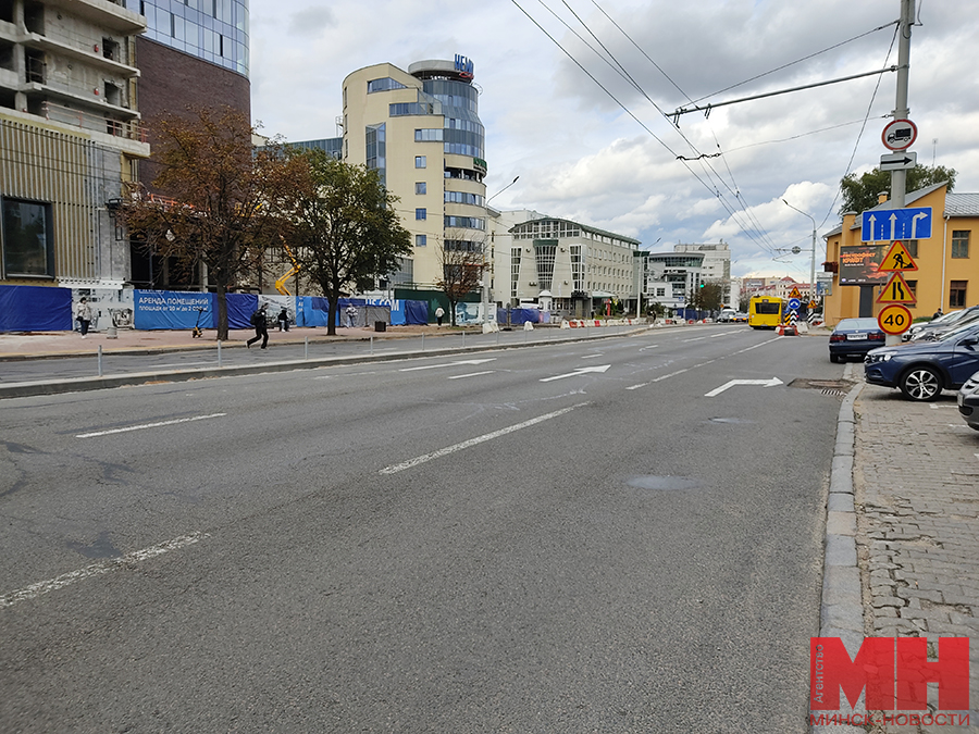 Дорожные работы ведутся как на проезжей части, так и рядом с ней. Особую осторожность и внимание водителям следует проявлять в районе дома № 40, где оборудован регулируемый пешеходный переход. Дорога здесь, если двигаться со стороны ул. Романовской Слободы, смещается вправо, что несколько затрудняет движение транспорта. Остановочный пункт «Мясникова» перенесен немного вперед. В направлении площади Ф. Богушевича проход для пешеходов временно закрыт.