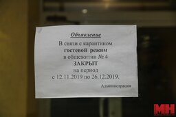 Меняем место дислокации. Следующая точка назначения — соседнее здание, общежитие того же БГАТУ, № 4. Правда, здесь нас встречает объявление, сообщающее о карантине и закрытии гостевого режима. Да и его длительность — 1,5 месяца — заставила несколько встревожиться. Таинственности добавила вахтер, которая не смогла сказать, из-за какого заболевания введен карантин.
