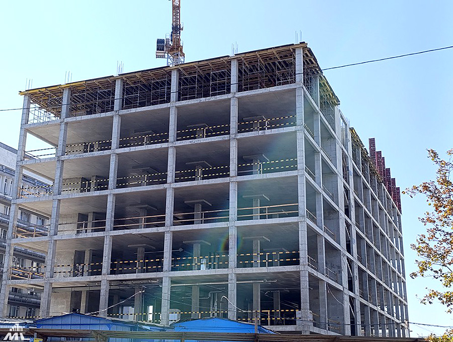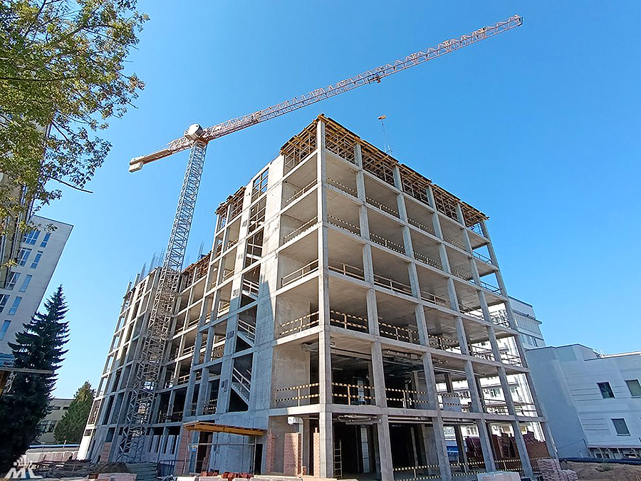 Монолитчики перекрыли седьмой этаж будущего медучреждения. По плану, до конца сентября должны возвести последний, восьмой этаж здания. Следующим этапом станет строительство двухэтажных пристроек, которые запроектированы с двух сторон корпуса.