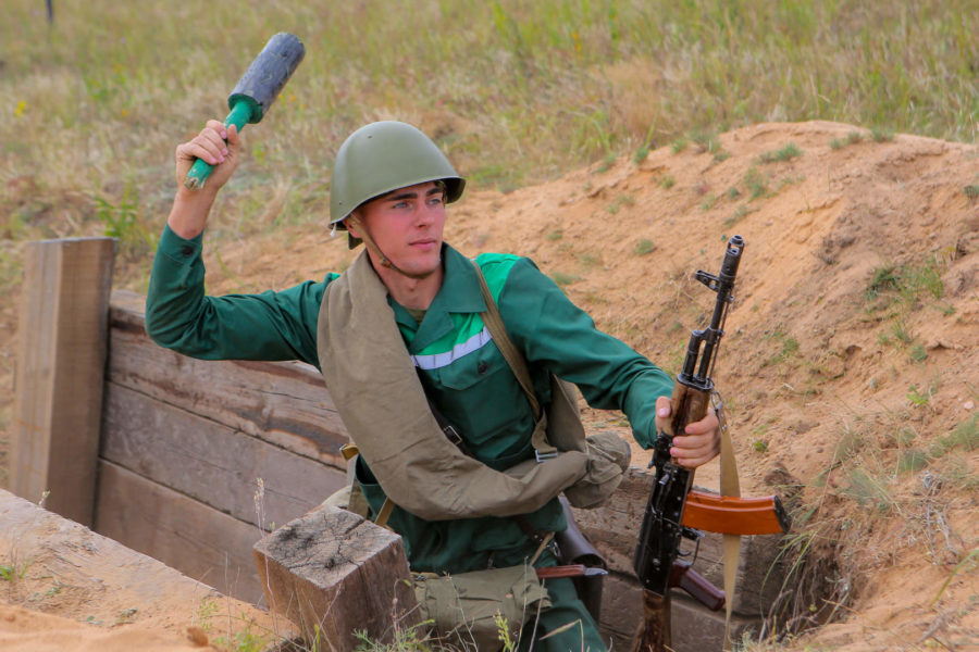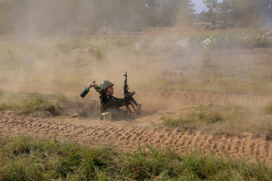 Еще при подходе танка обороняющемуся нужно открыть огонь из автомата, чтобы отсечь пехоту, а затем быстро спрятаться в окоп. Как только танк проедет над ним, уже вдогонку — метнуть учебную гранату в трансмиссию. На все про все уходит несколько минут, но каких! Эмоциональная и психологическая нагрузка у молодых людей довольно высокая.