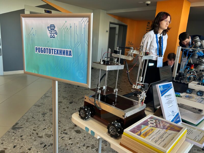 Сергей Стреха, ученик 11-го класса Столинской государственной гимназии, представил роботизированную платформу для складской логистики. Его разработка передвигается на всенаправленных колесах, оснащена манипулятором и камерой с широким углом обзора. На создание устройства понадобилось три месяца.