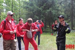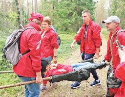 Участница квеста находит лукошко, в котором грибы, вода и таблетки. Значит, наш пенсионер здесь проходил. Через несколько метров девушка-волонтер падает. Идти сама не может — подвернула ногу. Приходится из подручных средств мастерить носилки. Парни в команде, как настоящие робинзоны, тут же находят две палки, снимают куртки и сооружают переносное устройство. Перекладываем туда пострадавшую и продолжаем путь. Координатор поясняет: во время поисков случается всякое, нужно уметь быстро принять решение. Выходим на тропинку. Кристина обращает внимание: это линейный ориентир (к нему также относится дорога, река, линия электропередачи). Если не дай бог заблудились, двигайтесь вдоль него. Рано или поздно выйдете к населенному пункту, станции.