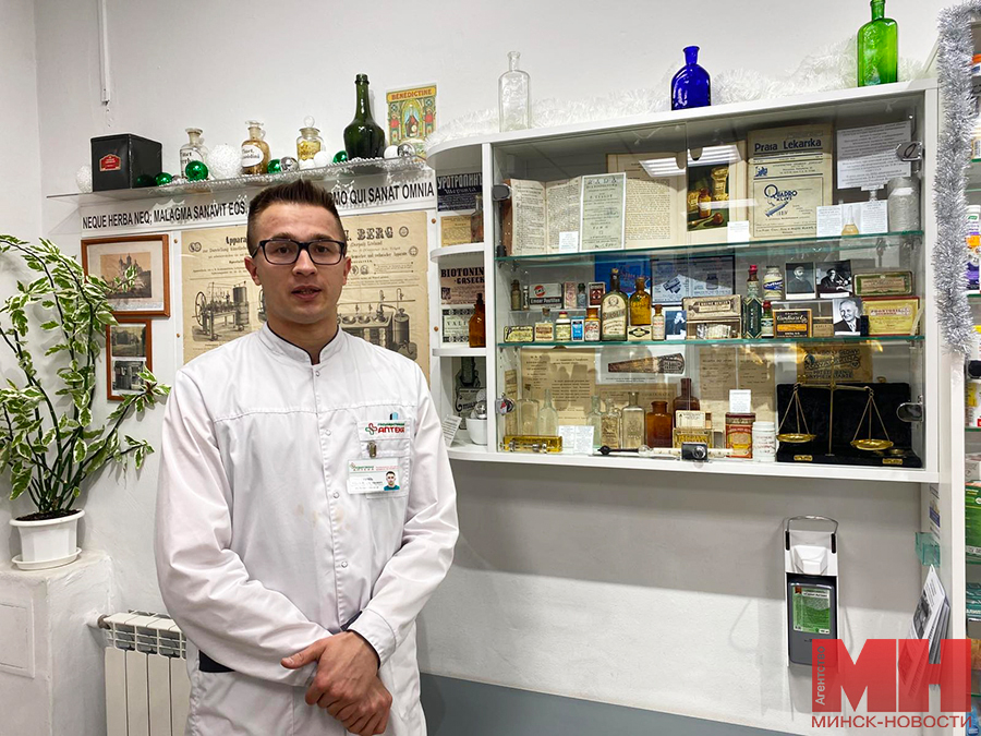 Заходим внутрь, и нас встречает молодой человек фармацевт-рецептар Иван Гринь, выпускник Витебского государственного ордена Дружбы народов медицинского университета, создатель и идейный вдохновитель экспозиции.