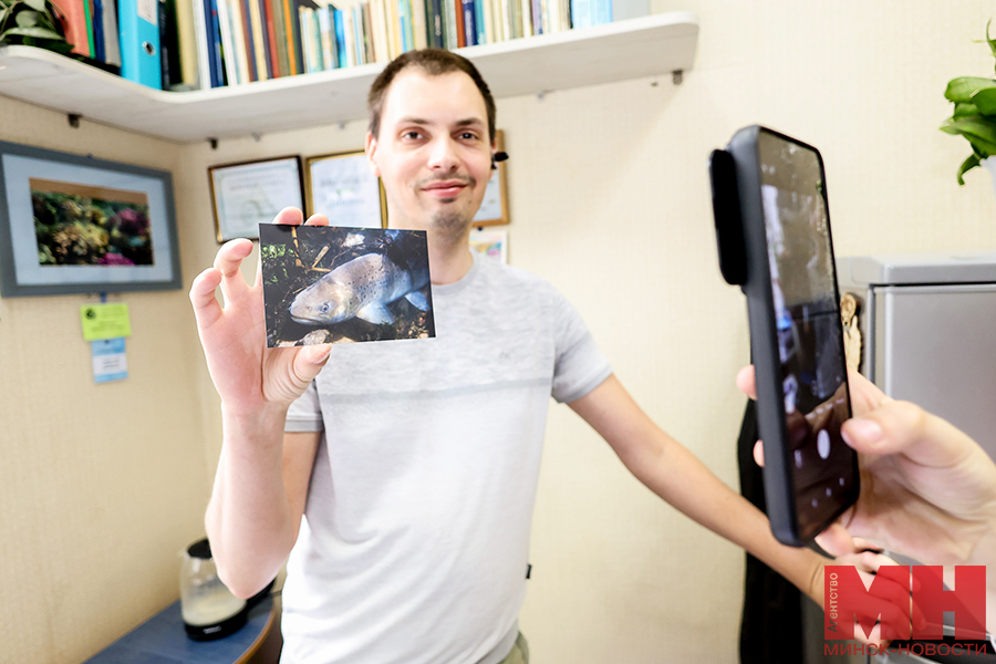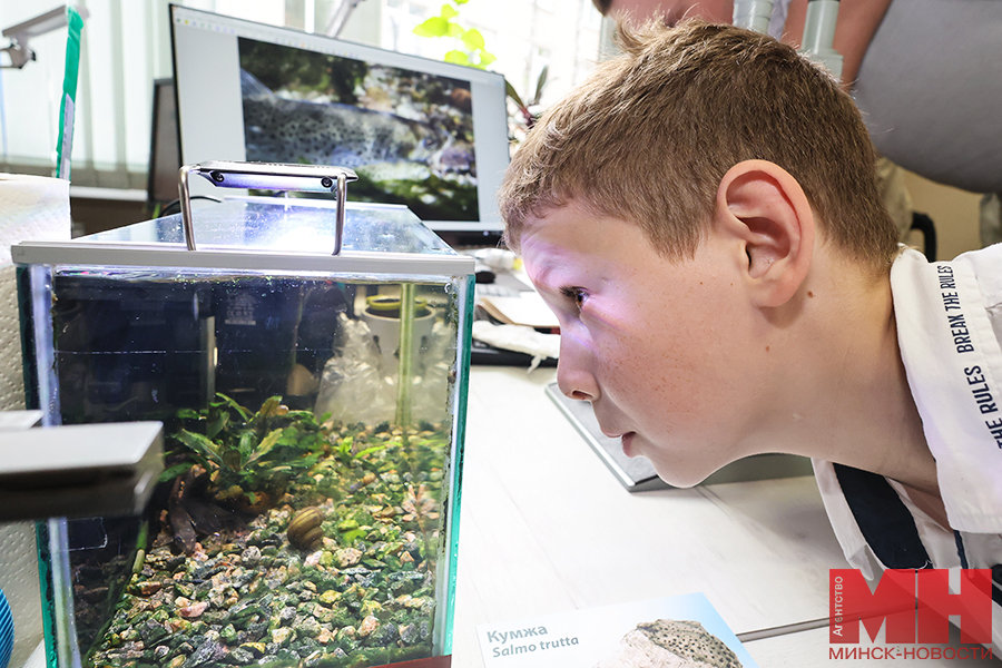 Следующей была лаборатория ихтиологии. Здесь научный сотрудник Алексей Полетаев показал детям чешуйную книжку, которую исследователи используют в экспедициях. Как выяснилось, по собранным в ней образцам чешуи рыб можно определить их возраст! Разумеется, для этого чешуйки надо рассмотреть под микроскопом. Главный же рассказ ученого-ихтиолога был посвящен редким и краснокнижным рыбам, обитающим в Беларуси. А именно — кумже семейства лососевых. Оказывается, эта рыба представляет один вид с нашей белорусской ручьевой форелью. Только, в отличие от кумжи, ручьевая форель — рыба оседлая. А ее более крупная «родственница» предпочитает курсировать по морям-океанам. Но на нерест идет в родные белорусские места.