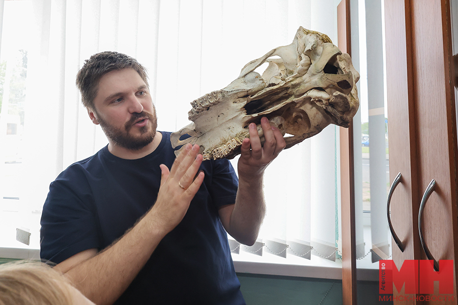 Следующий рассказ о природе Беларуси был посвящен млекопитающим. В лаборатории популяционной экологии наземных позвоночных школьники узнали, что из крупных животных чаще всего попадают в ДТП на наших дорогах косули. Бывают столкновения и с лосями. Это очень крупные животные, и аварии с их участием чреваты серьезными травмами для водителя и пассажиров. Детям показали череп лося, найденный учеными в лесу.