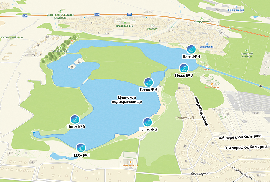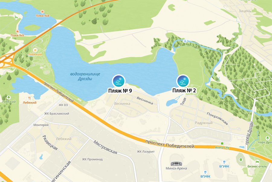 Шесть пляжей. На каждом есть все необходимое для разных видов отдыха: детское и спортивное оборудование, лежаки, кабинки для переодевания, скамейки, беседки, пункты проката и общепита. На сезон для отдыхающих устанавливают биотуалеты. На пляже № 2 имеется зона барбекю с мангалами, деревянными беседками и комплектами лесной мебели — с каждым годом она увеличивается.