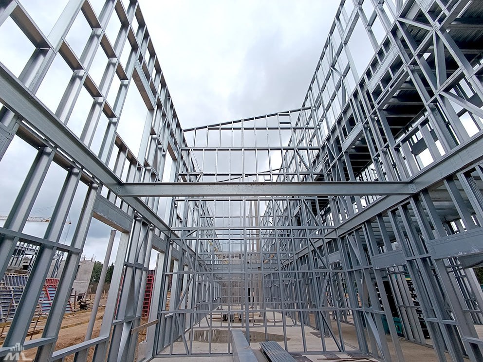 Монолитные работы на палатных корпусах завершены на 80 %, смонтированы каркасы из легких стальных тонкостенных конструкций на оба этажа. Сейчас монтажники приступили к стропильным системам.
