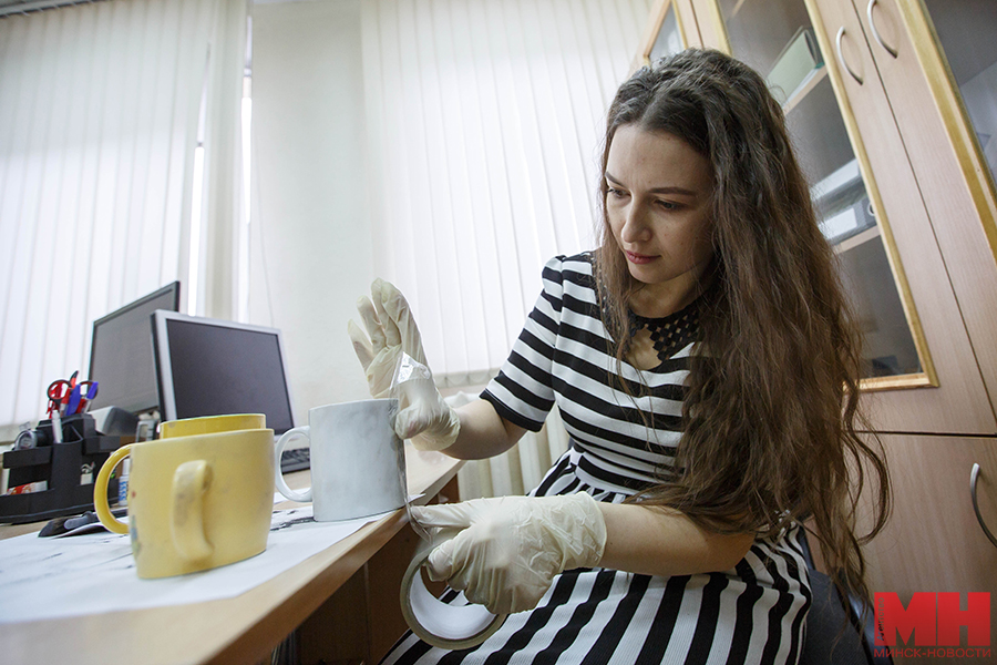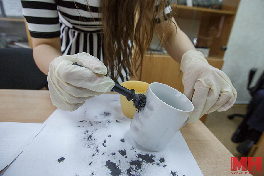 Решила провести эксперимент. Зная наверняка, что мои отпечатки есть в базе данных — много лет назад я проходила обязательную дактилоскопическую регистрацию — на одной из трех кружек оставила след, предложив государственному судебному эксперту управления криминалистических экспертиз и учетов управления ГКСЭ Республики Беларусь по г. Минску Ольге Поречной установить, кому он принадлежит. Девушка специальной кистью нанесла на поверхность чашек дактилоскопический магнитный порошок.