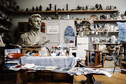 Скульптор идет по мастерской, на ходу поворачивая бюсты, поднимая гипсовые маски, и мы едва успеваем сфотографировать и записать: вот американская женщина-астронавт, вот китайский, а рядом первый румынский космонавты, вот скульптуры, которые еще ждут воплощения в бронзе, — «Космос», «Полет». Есть здесь также макеты памятников политикам, писателям, летчикам…