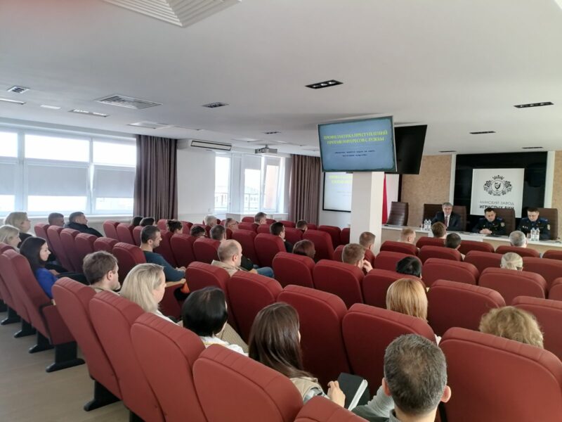 В присутствии работников предприятия рассмотрено представление по оконченному производством уголовному делу о преступлении, предусмотренном ч. 2 ст. 211 Уголовного кодекса Республики Беларусь («Растрата»), в отношении трех их коллег. П. Молчан рассказал об обстоятельствах преступления, сделав особый акцент на причинах и условиях, способствовавших его совершению. Он отметил, что данная категория преступлений не относится к коррупционным, однако степень их общественной опасности исключительно велика, поскольку в основном они совершаются работниками предприятий и организаций, на которых работодателем возложена ответственность за сохранность имущества и денежных средств.