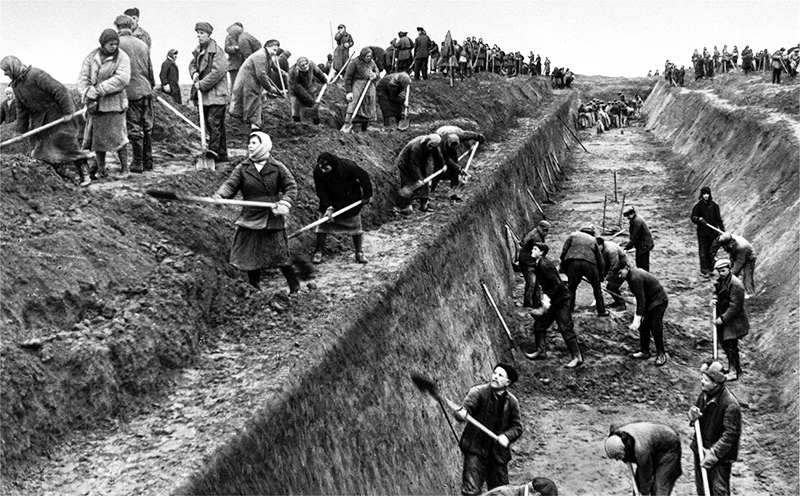 Хромала и организация процесса. Создавали новые полевые военно-строительные части. На работу над фортификационными системами направили более 100 крупных стройтрестов, организовывая их труд методом проб и ошибок. Конечно, инженерные войска не могли справиться с необходимым объемом. Широко привлекали население городов и сел. Мужчины от 15 до 55 лет, женщины от 16 до 50 взялись за лопаты. Только в течение 1941 года в строительно-оборонительных работах приняли участие около 10 млн человек. Упор делали на противотанковые заграждения. Например, лишь на Брянском направлении от Москвы в течение июля — августа 1941-го отрыли 3 570 км противотанковых рвов, 6 650 пулеметных окопов, возвели 2 300 пулеметных дотов и дзотов, 800 сооружений для 76-миллиметровых орудий. Успех в обороне Москвы во многом зависел от действий строителей. И они сделали свое дело.