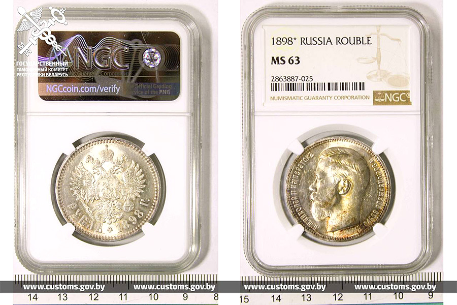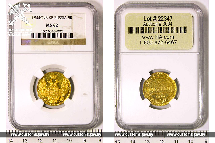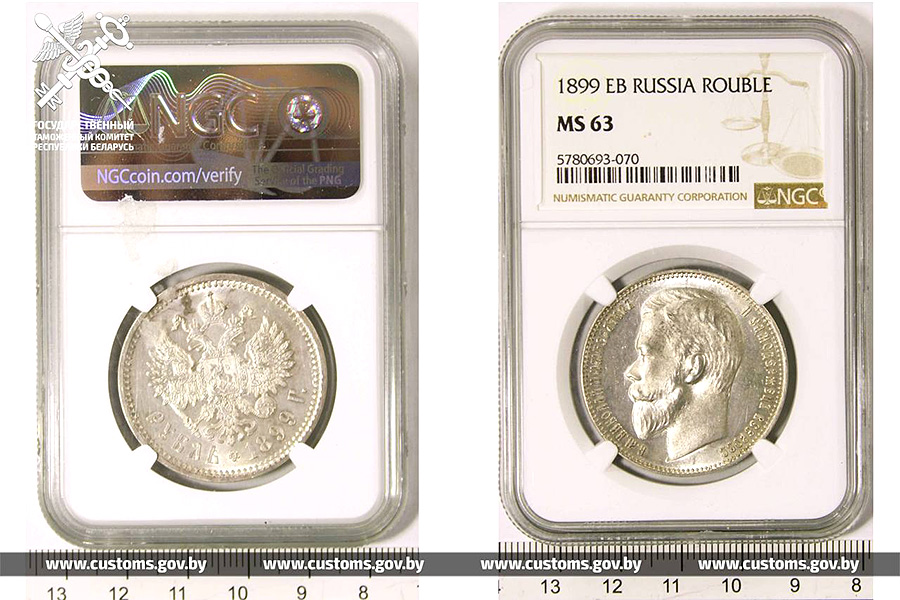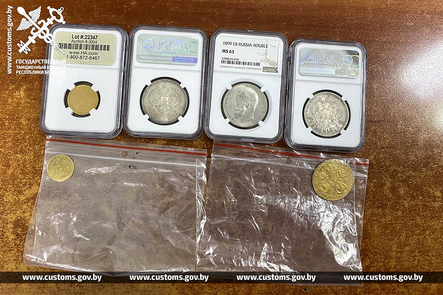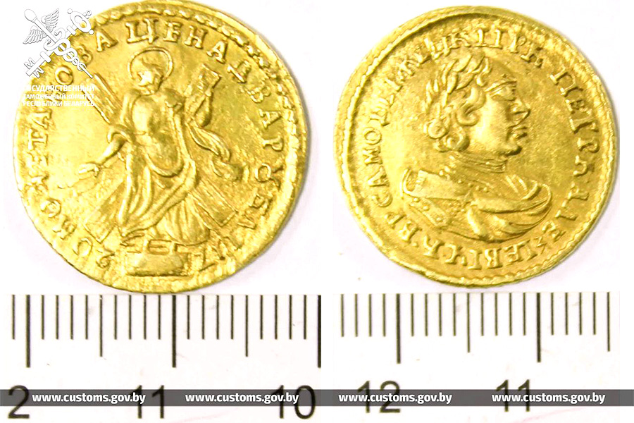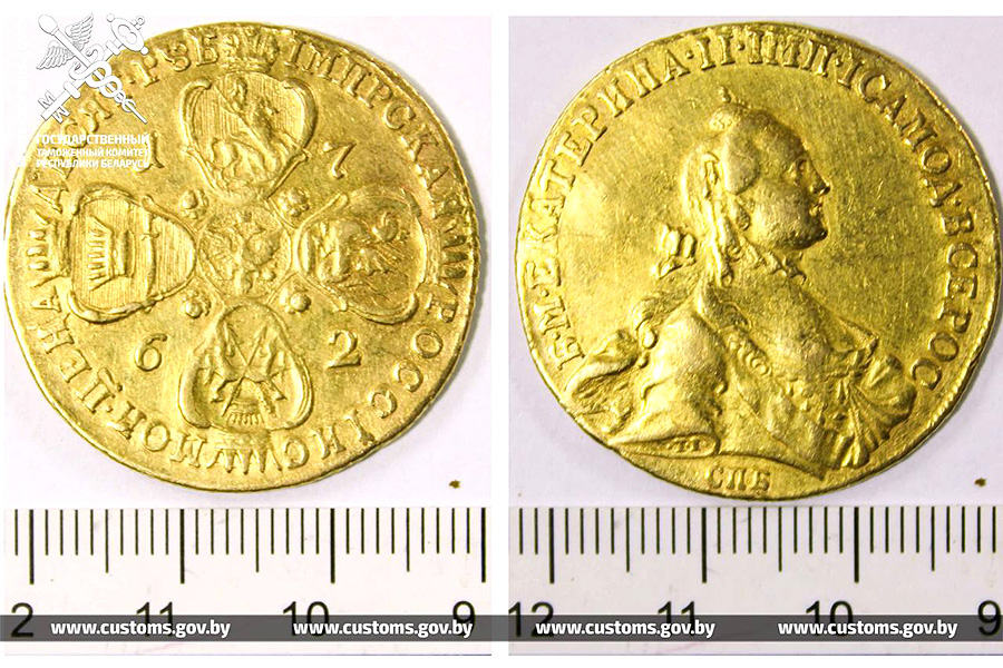 Самой дорогой среди артефактов оказалась золотая монета номиналом 10 рублей 1762 года выпуска, ее средняя цена на рынке — около 13 тыс. долларов. Стоимость отлитой из золота в 1720 году двухрублевой монеты 9,5 тыс. долларов, а пятирублевой 1845 года выпуска более 4 тыс. долларов. Стоимость трех серебряных рублей 1898, 1899 и 1910 годов выпуска превысила 8 тыс. долларов, — рассказали в Государственном таможенном комитете.