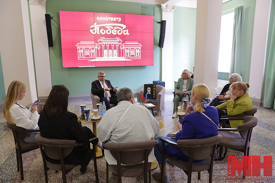 На встрече присутствовали также директор кинотеатра «Киев» Валентина Жорова и администратор кинотеатра «Победа» Светлана Савчик. Они показали знаковые фотографии, связанные с историей кино Минска, рассказали увлекательные истории о том, как кинотеатры становились центром притяжения культурной жизни столицы. Здесь горожане знакомились, общались — формировались семьи. Родители приводили детей в кино, а потом — и внуков.