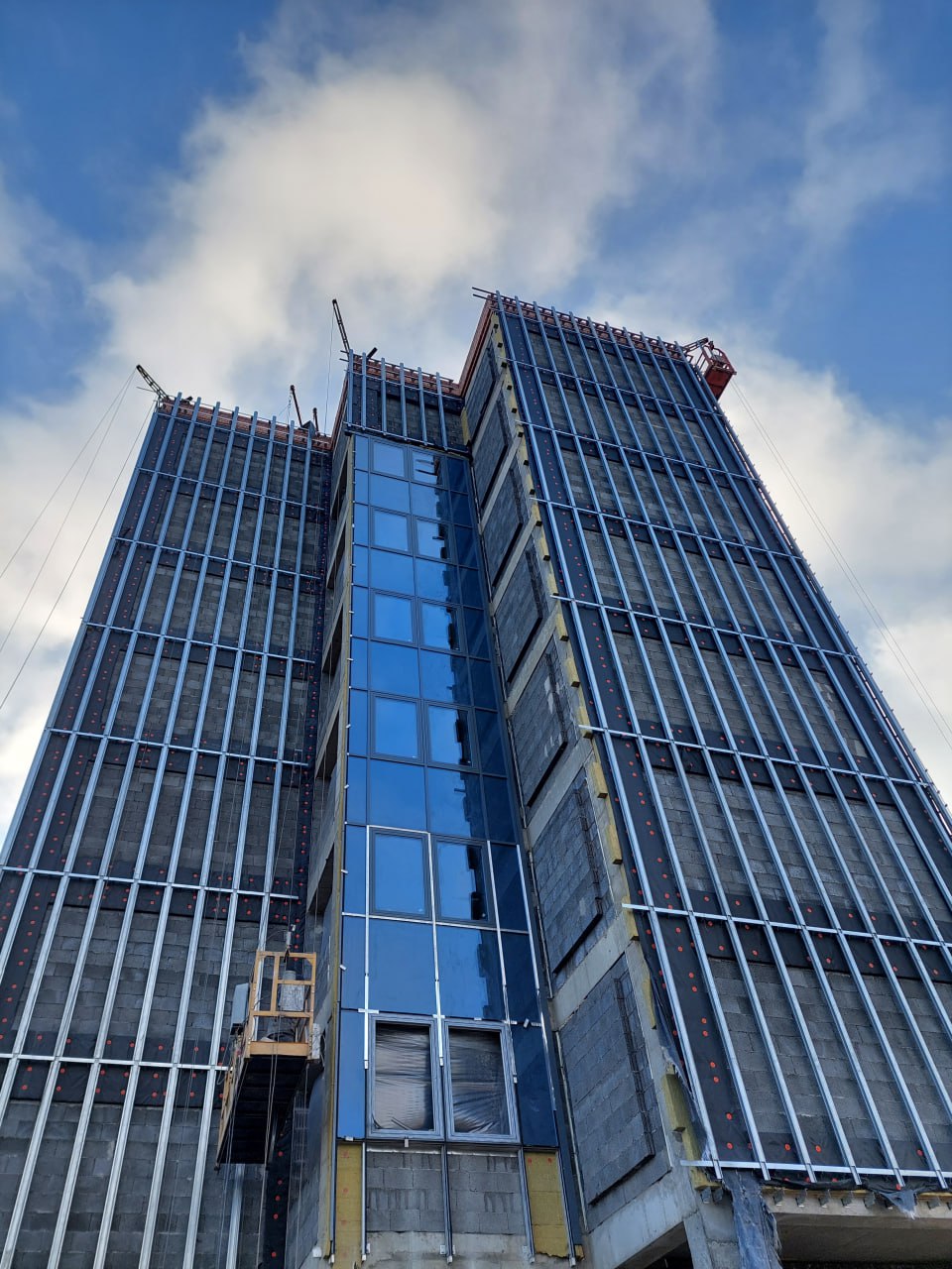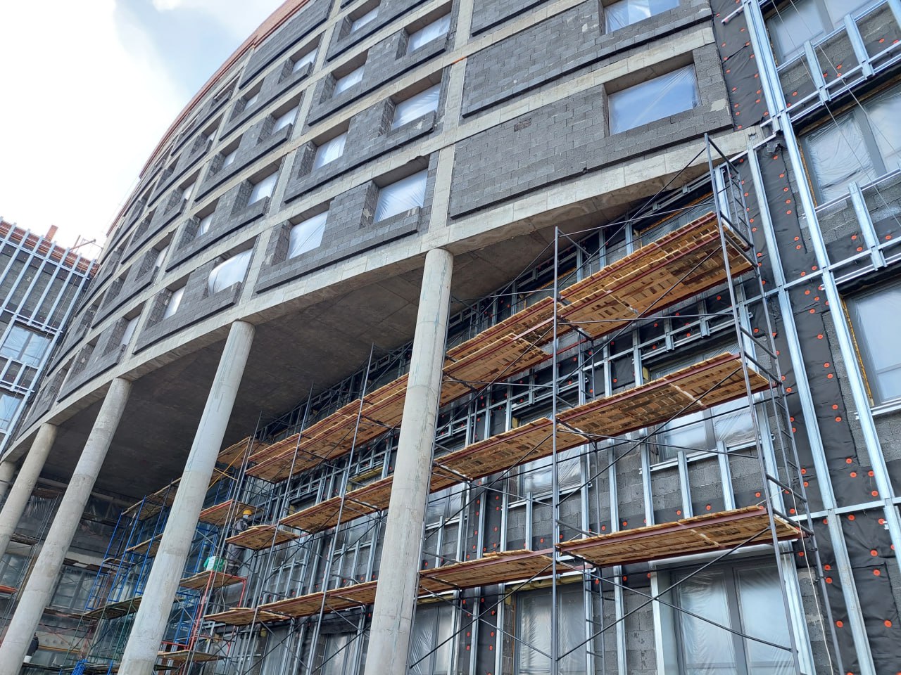 Медучреждение рассчитано на 850 посещений в смену. Сейчас на фасадах здания строители крепят направляющие под вентсистему, которая будет из керамогранита, а также монтируют витражи. В торцах они готовы, над входной группой — в процессе.