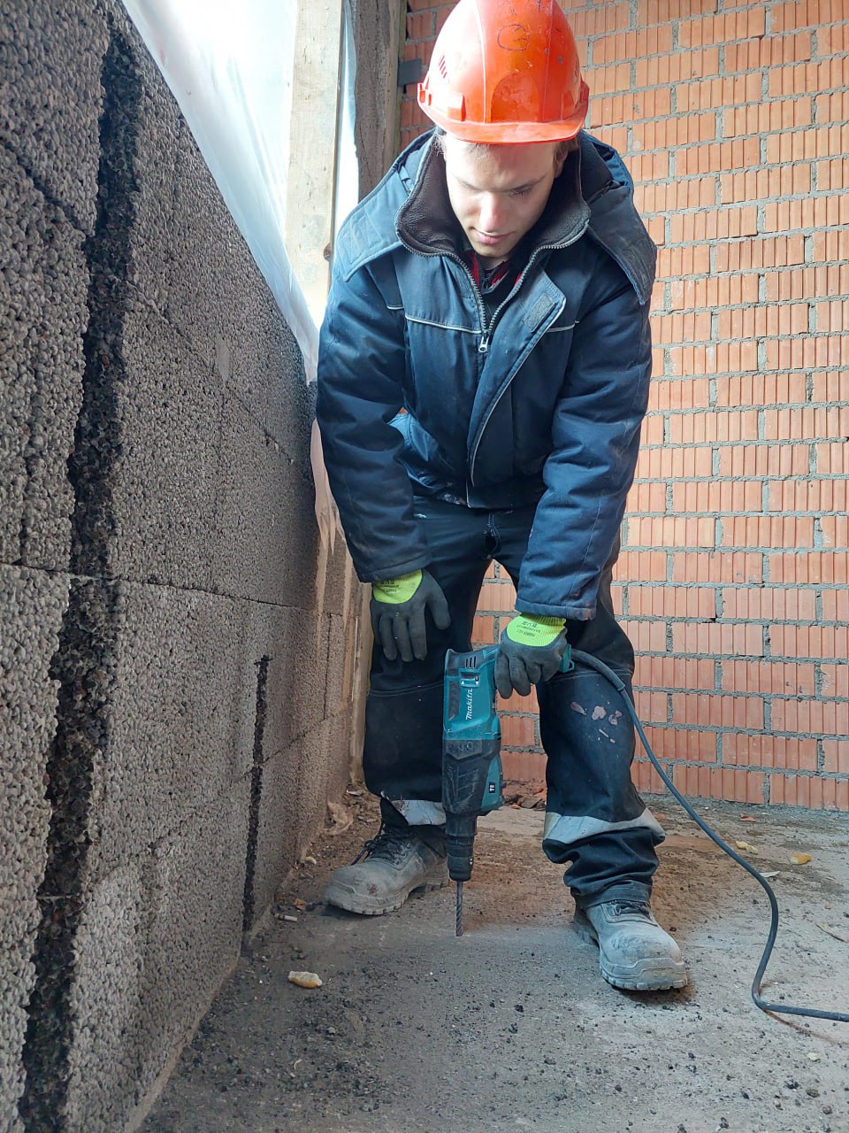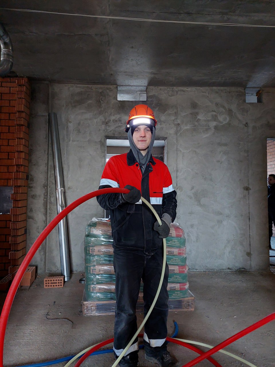 Также трудятся каменщики и штукатуры, автокраном на этажи подаются мешки со смесями. Электрика пока черновая, она находится в работе. Сантехники осуществляют разводку по полам, красный и синий пластик потом утеплят и сделают стяжку.