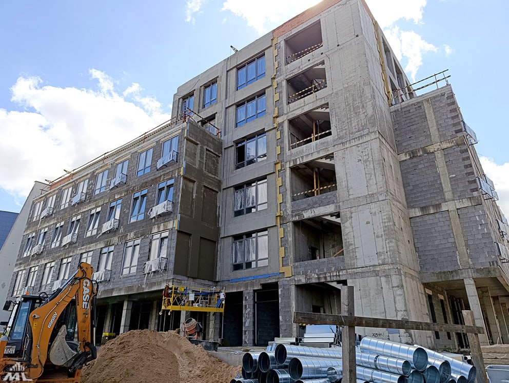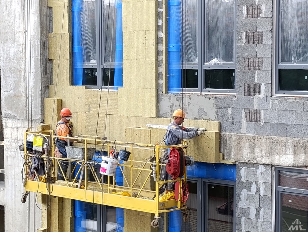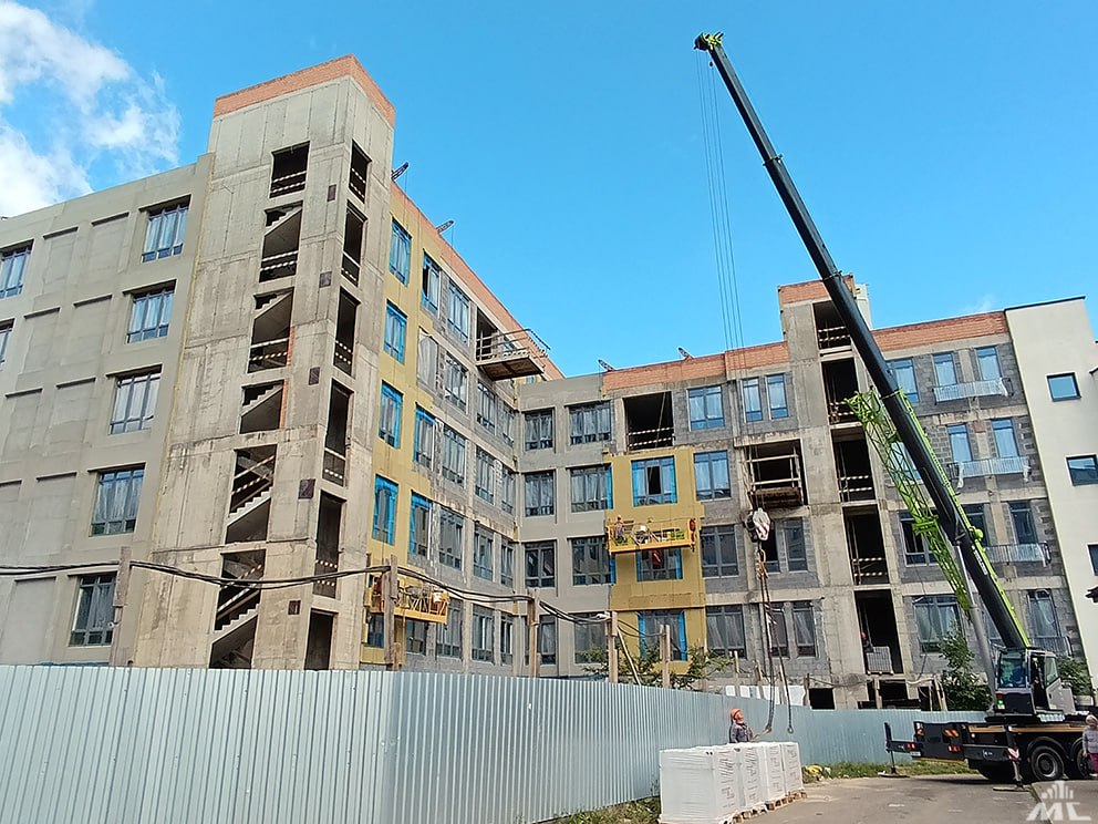 На данный момент на объекте уже начались отделочные работы, здание постепенно приобретает завершенный вид. Рабочие занимаются отделкой фасада, укладкой плитки, электромонтажом и сантехническими работами. Башенный кран уже демонтировали — это значит, что в скором времени будут подведены все коммуникации.
