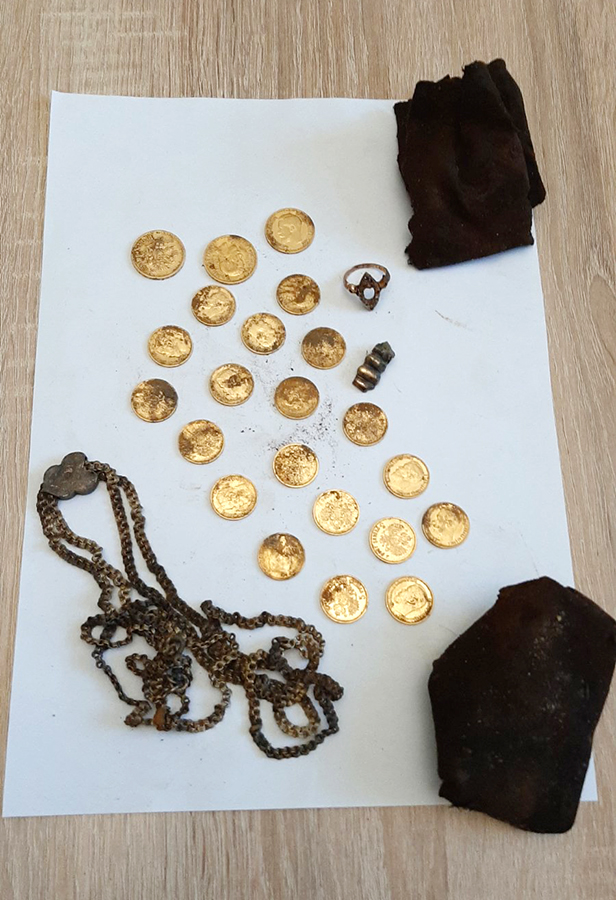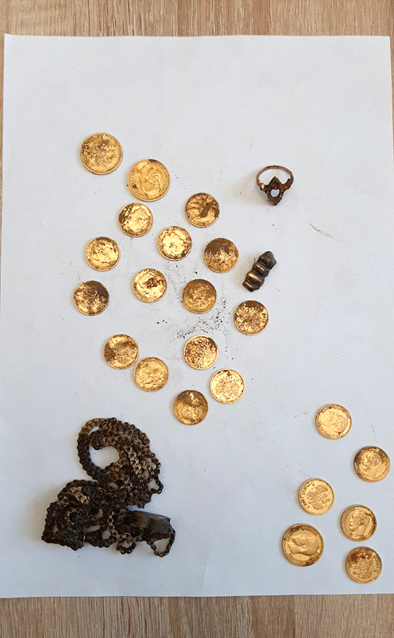— Как часто говорю, специалистам-археологам найти клад сложнее, чем кому-то со стороны, — поясняет Вадим Лакиза. — Повезло, что его обнаружил человек, неравнодушный к истории столицы и Беларуси. Он поступил по закону. На место находки в сквере Марата Казея тут же выехали наши сотрудники и изучили его. Всего удалось найти 24 золотые монеты времен Николая II, кольцо, цепочку (возможно от часов или просто аксессуар), два зубных протеза. Скорее всего, ценности спрятали завернутыми в кожу или кошель, части которого обнаружили рядом с ним. Помимо этого, нашими сотрудниками в отвале и траншее выявлены и другие археологические материалы.
