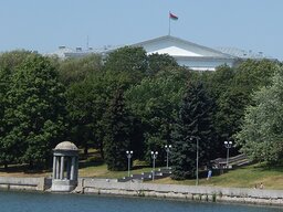 Под конец экскурсии предлагаю кратковременный отдых с фотосессией на набережной Свислочи, в парке, получившем недавно название «Старостинская Слобода». Это возле Дома Москвы, у памятника Пушкину, откуда открываются прекрасные виды на пр. Победителей, ул. Немигу, речку.