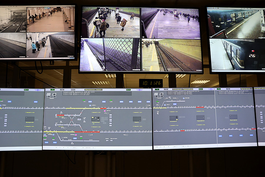 В просторном помещении в абсолютной тишине находится лишь один специалист. Здесь установлены два ряда больших мониторов с различными изображениями и обозначениями. На них разными цветами отображены поезда, трассы их движения, рельсовые пути, тупики и стрелки. На настольные экраны в полном формате выводится обстановка со всех 14 станций второй ветки столичной подземки.