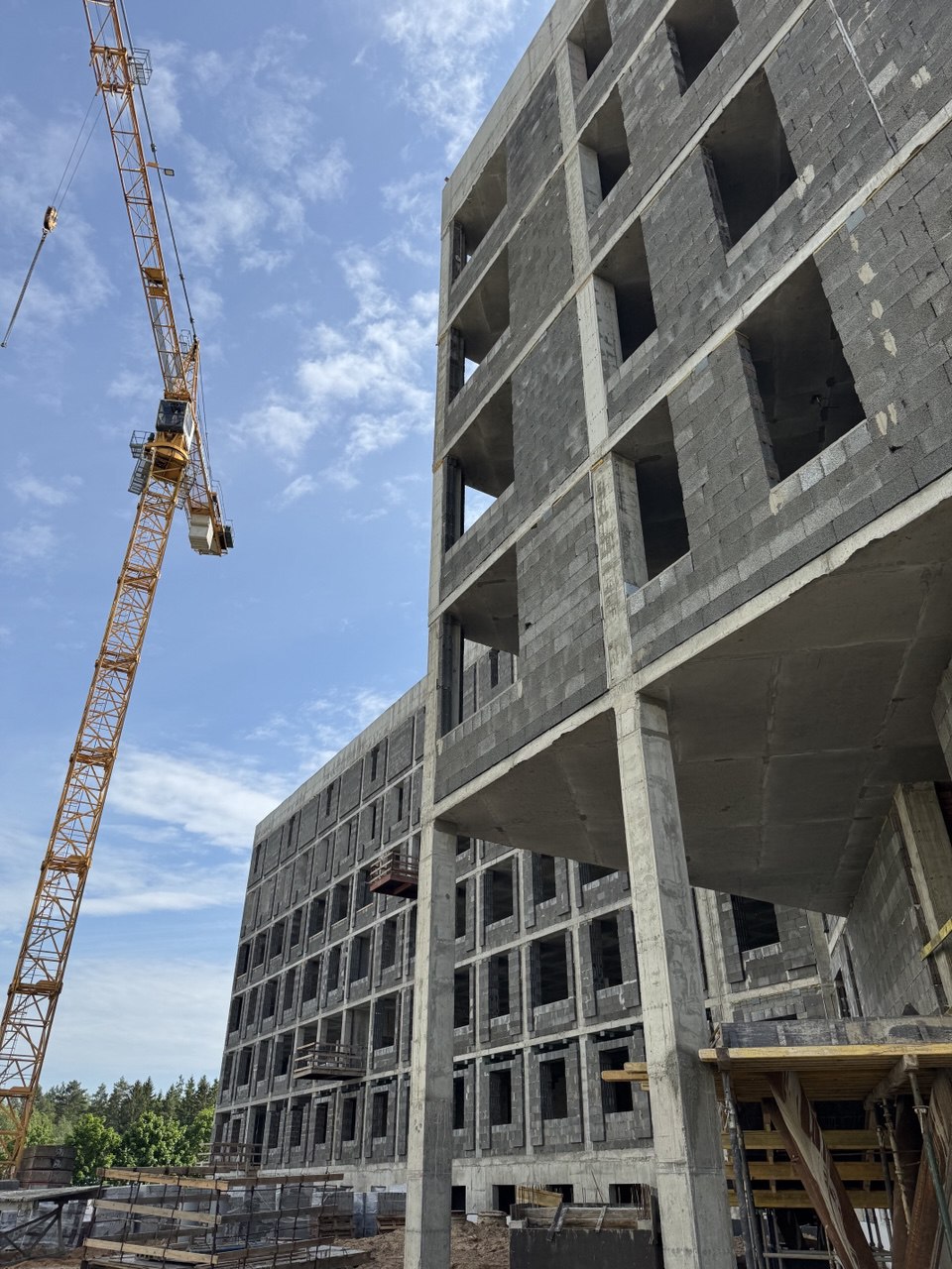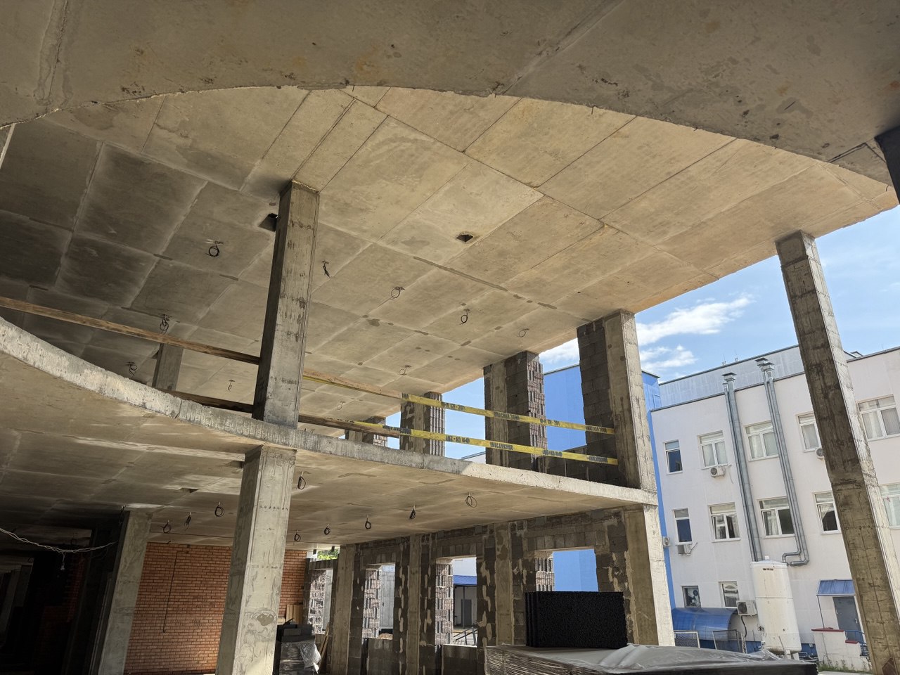 Сейчас здание уже обрело очертания: завершаются кровельные работы и кладка наружных стен, идут внутренние отделочные работы — монтаж перегородок, электропроводки, сантехники и штукатурка. В ближайшее время начнется установка оконных блоков.
