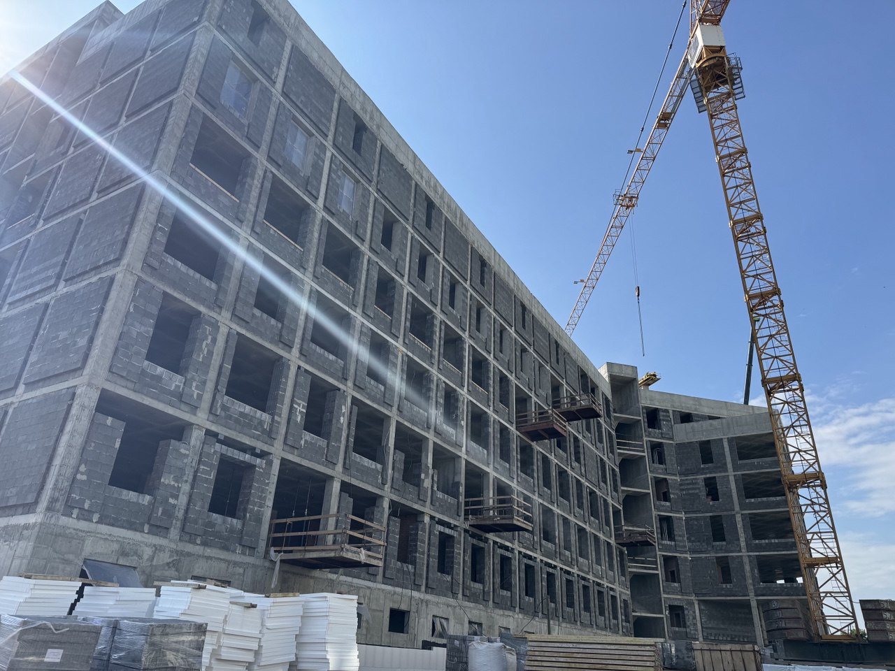 К объекту подведены инженерные коммуникации, параллельно возводится газовая котельная. На прошлой неделе с площадки демонтировали один из башенных кранов, второй продолжает работу.