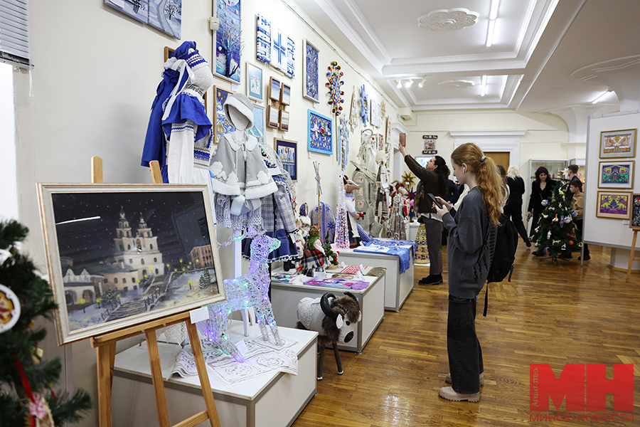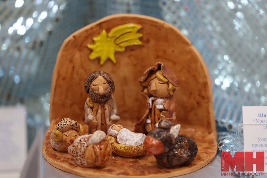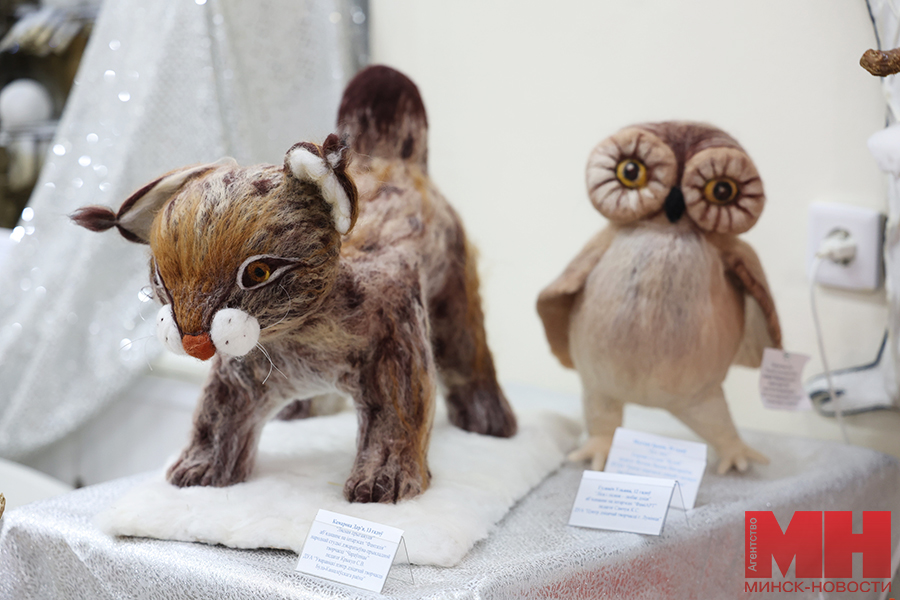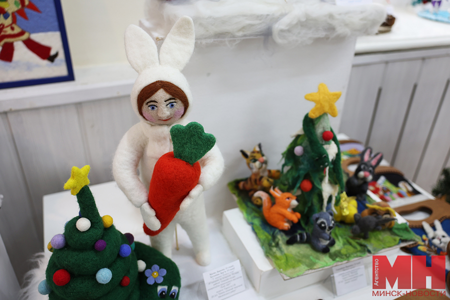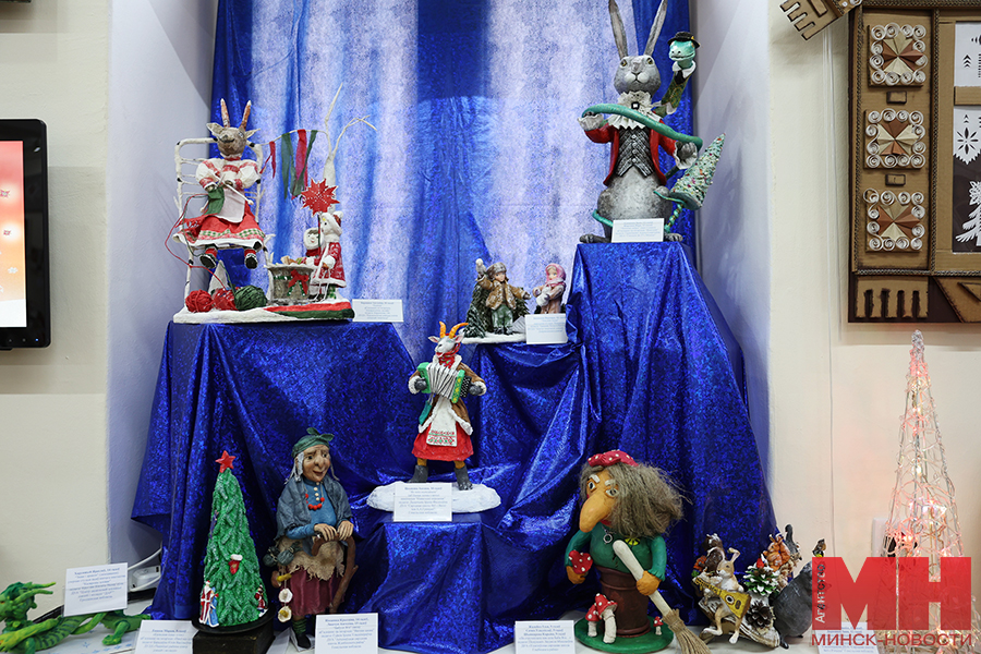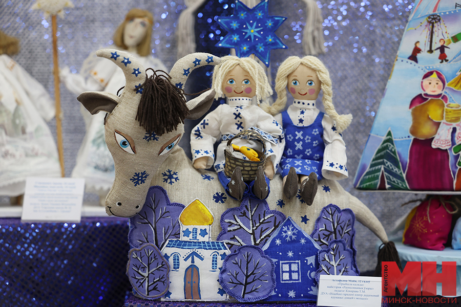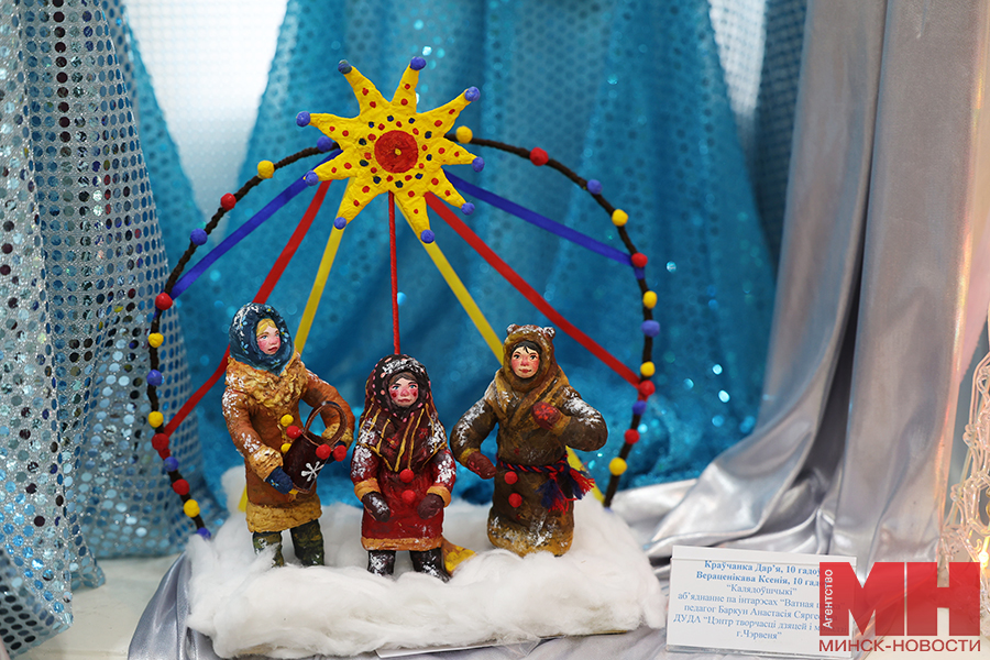 Позже у желающих была возможность познакомиться с творчеством призеров. Стоит отметить, что работ немало — больше сотни. В выставочном павильоне «поселились» деревянный Дед Мороз в необычном наряде — вместо традиционной красной шубы его одежду украшают многочисленные зимние сюжеты; милые игрушки калядной козы, в том числе в национальном белорусском костюме; персонажи сказки «Снегурочка»; Иисус Христос с Девой Марией и Иосифом; куклы из разных материалов в праздничных нарядах. Многие мастера создали сюжеты, посвященные зимним праздникам и забавам. Привлекают внимание и представители белорусского животного мира: зубры, олени, лисы из соломы, глины и текстиля. Каждое изделие продумано до мельчайших деталей, даже самые привередливые посетители вряд ли смогут отыскать изъяны.