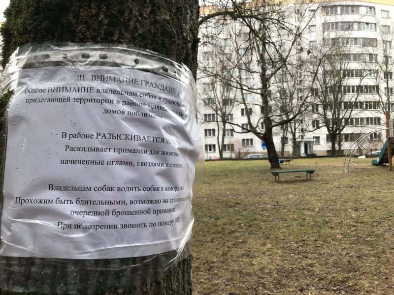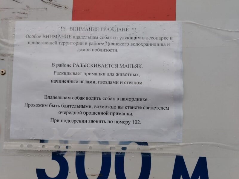 Во время прогулки мы нашли около двух десятков предупреждений, расклеенных на деревьях. Авторы текста оказались весьма категоричны: «В районе разыскивается маньяк. Раскидывает приманки для животных, начиненные иглами, гвоздями и стеклом», — сказано в объявлении. Также прохожих призвали быть бдительными, выгуливать собак в намордниках и звонить на 102 в случае обнаружения живодеров или подобной приманки.