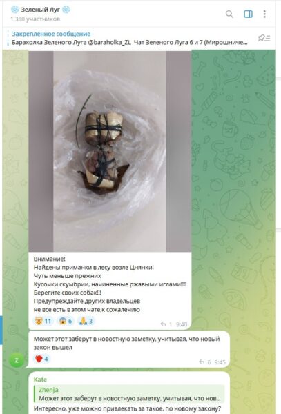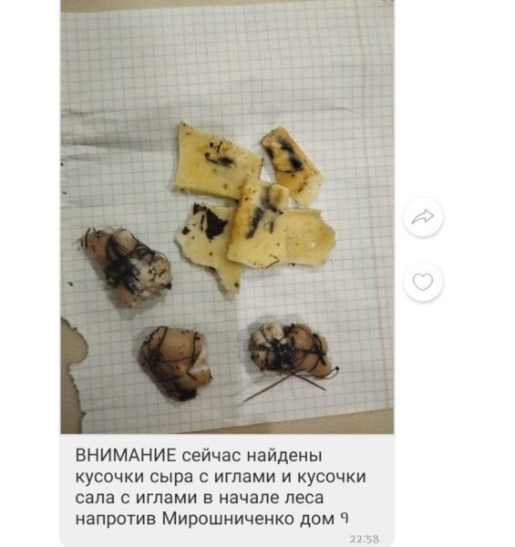 «Если кто с собаками гуляет по горке к Цнянке на ул. Мирошниченко, будьте бдительны!»; «Внимание! В начале леса напротив Мирошниченко, 9, сейчас найдены кусочки сыра и сала с иглами»; «Снова найдены приманки в лесу возле Цнянки, чуть меньше прежних — кусочки скумбрии, начиненные ржавыми иглами. Берегите своих животных!».