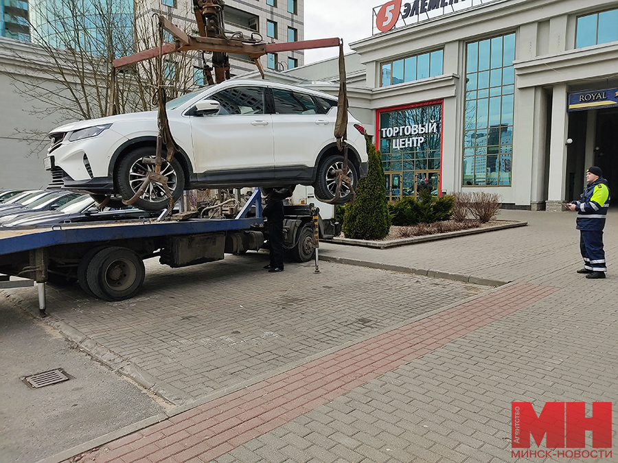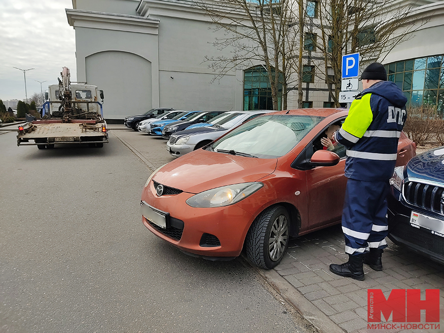 Следом за патрульным автомобилем приезжает эвакуатор. Инспектор внимательно осматривает машины со всех сторон. У всех отсутствует опознавательный знак «Инвалид». Четверо владельцев из пяти успели до эвакуации вернуться на парковку. Каждому сотрудники ГАИ выписали штраф в размере 2 базовых величин. Пятый нарушитель правил будет вынужден кроме штрафа заплатить за перемещение своей машины на охраняемую стоянку на ул. Семашко, 17, и хранение там. А пока нужно оформить протокол осмотра. В него заносятся данные автомобиля, видимые повреждения кузова, бамперов, колес, стекол машины, чтобы потом не было претензий со стороны владельца транспортного средства, мол, по дороге нанесли ущерб имуществу на колесах. После машину помещают на платформу эвакуатора и увозят.