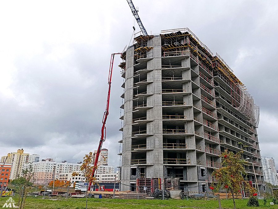 В микрорайоне Брилевичи на ул. Каролинской продолжают строительство жилого дома. Он прибавляет по три этажа ежемесячно, сообщает корреспондент агентства «Минск-Новости» со ссылкой на «Минскстрой».